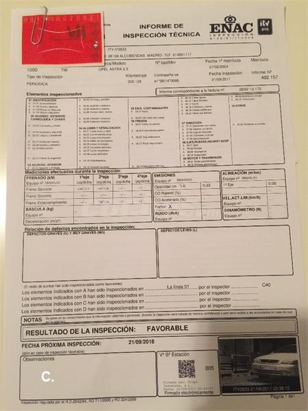 Se vende Opel Astra 2.0 DTI 16V Edition 100 CV 5 puertas; Matriculación: Febrero 2004; Características: Motor diesel de 100 CV con correa de distribución de cadena; Equipamiento: Sensor de lluvia, Espejo interior fotosensible, Volante multifunción, Teléfono manos libres (Parrot), Cierre centralizado con mando a distancia, Llantas de aleación, Aire acondicionado, Elevalunas eléctricos delanteros,Radio-CD, ABS , Control de tracción, 4 Airbag; Otros datos: único propietario, sin siniestros-pintura original de fábrica (80%), mantenimiento prácticamente al día, ITV pasada sin fallos el 21-09-2017(ver foto documento ITV).