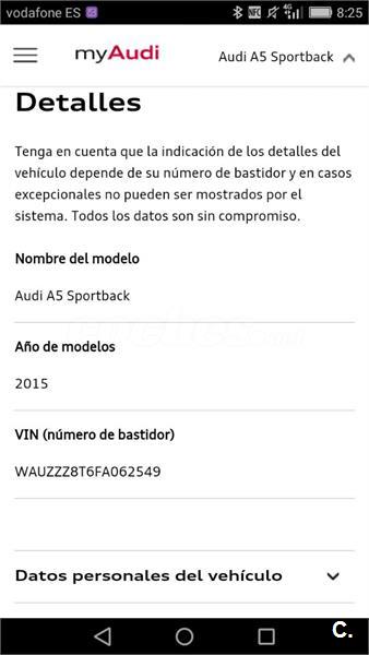 Vendo Audi A5.Es de julio de 2015 modelo sportback 2.0 tdi 190 cv clean diesel.Llantas rotor de 19 pulgadas con neumáticos michelín.Equipamiento:Volante multifuncion,clima bizona,entertaiment mmi,navegador,teléfono,streaming, start stop,4 plazas,fijaciones isofix,lunas tintadas homologadas,asistente de arrancada en pendiente, apoyabrazos delantero y trasero,sensor de parking trasero,asientos calefactables. Revision en libro digital al día,todas las inspecciones en audi pasada ahora mismo la de los 60000 km con cambio de pastillas de frenos delanteras.Itv hasta julio de 2019.Precio solo ésta semana