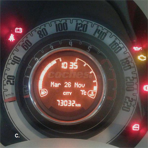C2 - desde 12/2013F1 - Aire acondicionado [025]G1 - Cierre centralizado con mando a distancia [008]G3 - Elevalunas eléctricos [028]G9 - Retrovisores eléctricos/térmicos/abatibles [041]H2 - Blue and Me [4J3/6RR]H3 - Radio-CD/MP3 [717]I2 - Faros antiniebla [097]J8 - Asiento conductor regulable en altura [626]J9 - Respaldo de asiento trasero partido [195]K8 - Kit Cromo [4MQ/4PK]N1 - 1242 cc (1.2 Ltr) 69CV/51kW [1.2_BZ_49/51/CF4/CF5]P3 - 5 velocidades [005]Q1 - Servodirección eléctrica [112]Q6 - Airbag de acompañante [502]R3 - 185/55 R 15 .. HS3 - 6 J x 15 aleación [431]V3 - Airbag de rodillas [150]V4 - Airbags laterales de cabeza [614]V5 - Airbags laterales [505]V6 - Norma antipolución Euro 6 [ECO#CF6/6X9]V8 - Techo panorámico [59E]Z8 - Bicapa sólido