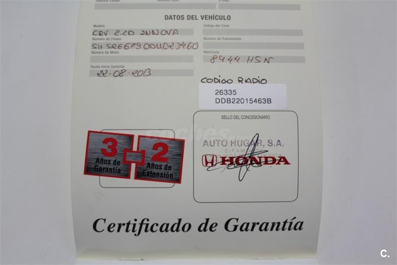 HONDA CR-V 2.2 i-DTEC 150 CV INNOVA , Kms: 118973, Bastidor: SHSRE6790DU023460, Fecha matriculación: 10/08/2013, Climatizador, techo panorámico, asientos en piel , eléctricos con memoria y calefactados, navegador, tracción 4x4, faros de xenon, control de velocidad adaptativo, aviso de salida de carril, bluetooth multimedia, sensores de aparcamiento del /tras, cámara trasera, portón trasero automático, conexión video / audio, ESP, ISOFIX, USB....