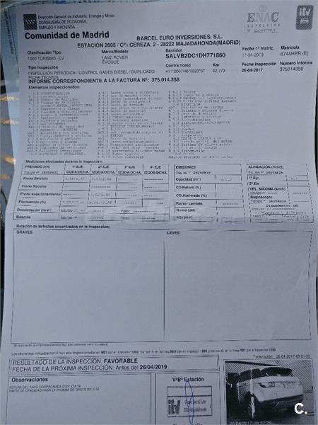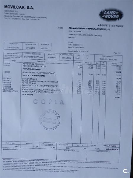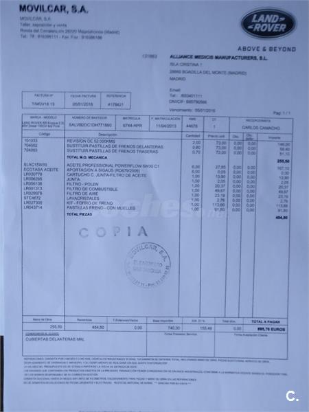 Ultima revisión: Cambio frenos delanteros y traseros, cambio de los tres filtros: aceite, aire y polen. Todas las revisiones en casa oficial Land Rover.
