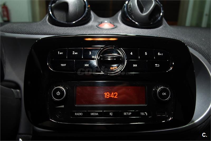 SMART FORFOUR 52 PASION 5P. VEHICULO NACIONAL. UNICO PROPIETARIO. VEHICULO NUEVO CON 4.000 KM. MATRICULADO EN 03/2016. BICOLOR BLANCO NEGRO CON INTERIOR EN TELA NEGRA ANTRACITA.3 Cilindros, 5-Velocidades ABS, Airbag del conductor, Airbag acompañante, Radio, Dirección asistida, Elevalunas eléctrico, Llantas de aleación, Cierre centralizado, Faros antiniebla, Inmovilizador, Climatizador, Control de tracción, Airbags laterales, Control de velocidad, Ordenador, ESP, MP3, Start/Stop automático, Volante multifunción, Luz diurna, Retrovisores laterales eléctricos, Bluetooth, Manos libres, ISOFIX, CD, Volante de cuero multifuncion. etc..