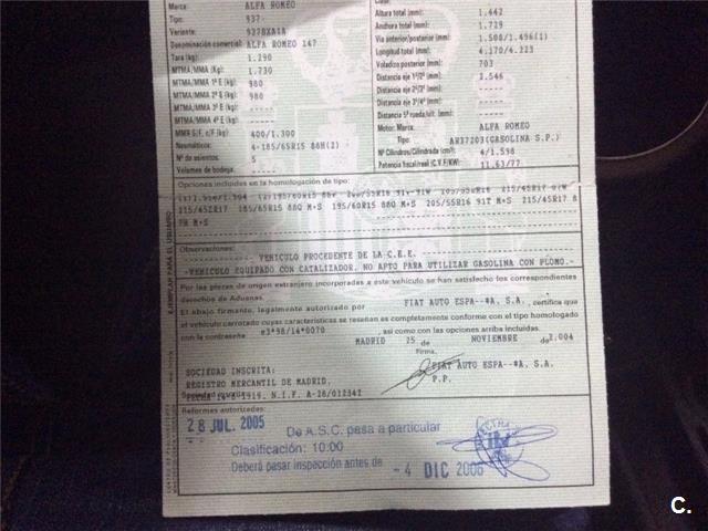 ALFA ROMEO 147 1.6 T. Spark Distinctive, vehículo nacional en buen estado, dos llaves, libro de revisiones disponible, gasolina, 105 cv, equipado con ordenador de a bordo, ABS/ESP, aire acondicionado, volante de cuero, cierre centralizado, control de tracción, elevalunas eléctricos, retrovisores laterales eléctricos, reposabrazos, dispositivo manos libres, sistema de audio con lector CD y MP3. GARANTÍA ADICIONAL 300".