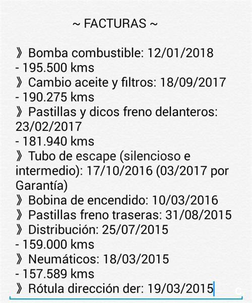 Uno de los mejores motores en relación consumo - potencia de su tiempo. Llantas de aleación modelo Exclusive, aire acondicionado, elevalunas eléctricos delanteros, faros antiniebla, apoyabrazos central, aire acondicionado, asiento del conductor regulable en altura, radio Kenwood con Usb y entrada Aux. , altavoces Alpine. Entrego facturas de todo lo que se le ha hecho en los últimos 3 años, duerme en garaje, coche de no fumador, en buen estado, ITV en vigor hasta septiembre, documentación al corriente, se usa a diario por población y viajes en autovía. Transferencia a cargo del comprador. Mejor ver y probar!! También atiendo Whatsapp. eléctricos delanteros, faros antiniebla, apoyabrazos central, aire acondicionado, asiento del conductor regulable en altura, radio Kenwood con Usb y entrada Aux. , altavoces Alpine. Entrego facturas de todo lo que se le