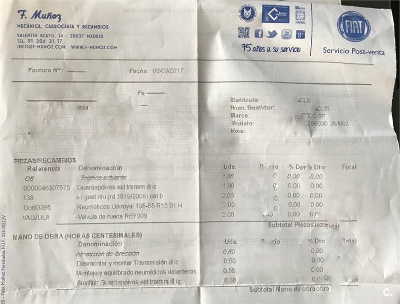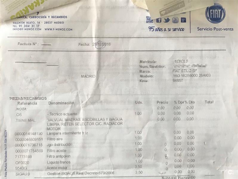 VENDO FIAT STILO - PRECIO NEGOCIABLE. TIENE UNA FALLA INTERMITENTE: “Avería Seguridad”; ES REPARABLE PERO COMO ME HE COMPRADO UN COCHE NUEVO NO ESTÁ EN MIS PLANES HACERLO. EL COCHE FUNCIONA PERFECTO DE MOTOR Y MANEJO. AÑO: 2003; Km: 112171; BUEN ESTADO EN GENERAL TANTO DE INTERIOR COMO DE EXTERIOR. SIMPLEMENTE DESGASTE Y GOLPES POR SUS AÑOS (en las fotos se puede apreciar) DOBLE CLIMATIZADOR DIGITAL, DIRECCION ASISTIDA, RADIO/CD ORIGINAL (Radio funciona perfecto pero el reproductor de CD no lo coge), ELEVALUNAS ELÉCTRICOS, ESPEJOS ELECTRICOS, ORDENADOR DE ABORDO, CIERRE CENTRALIZADO, AIREADORES EN PLAZAS TRASERAS, FAROS ANTINIEBLA DELANTEROS Y TRASEROS, REGULACION INTERIOR DE FAROS, ETC. NEUMÁTICOS CON MUY POCOS KM. (Ver foto de factura). JUEGO DE DISTRIBUCIÓN CAMBIANDO, RADIADOR NUEVO, ACEITE, FILTROS, FRENOS. (Ver foto de factura). CONTACTAR POR MAIL O WHATSAPP DE 10 a 16 hs. PARA MAS DETALLES seisnueveunotresnuevedosunonuevesiete.