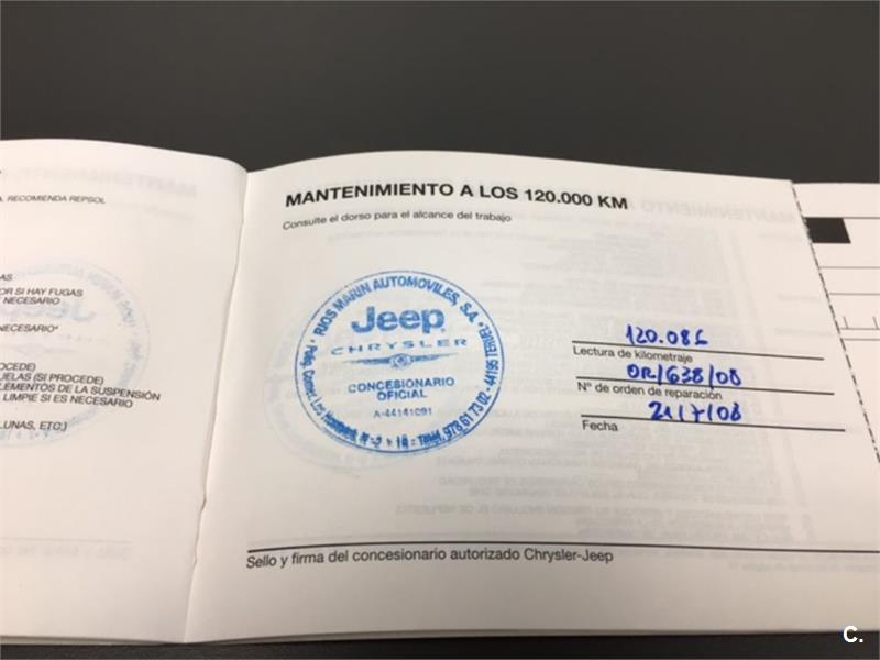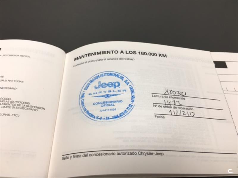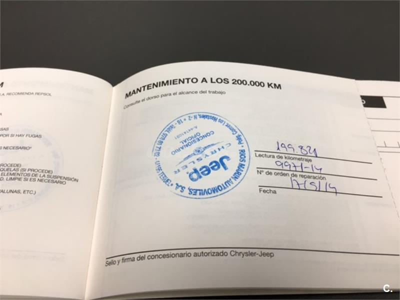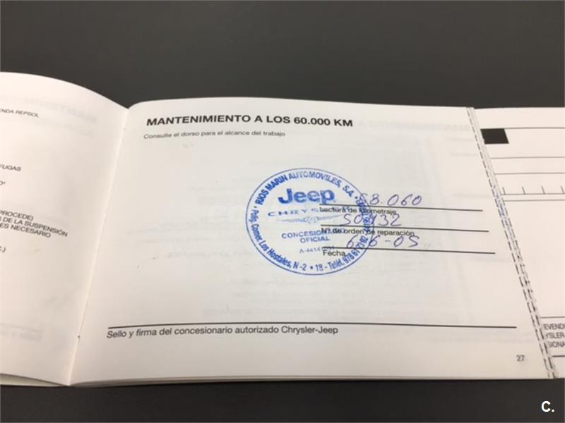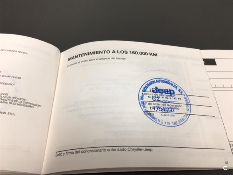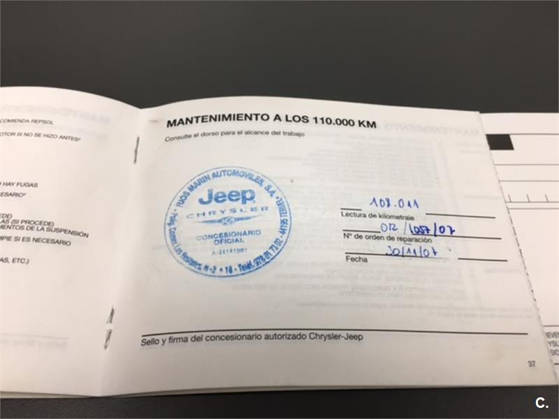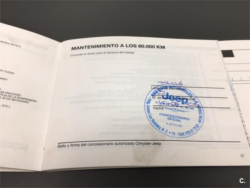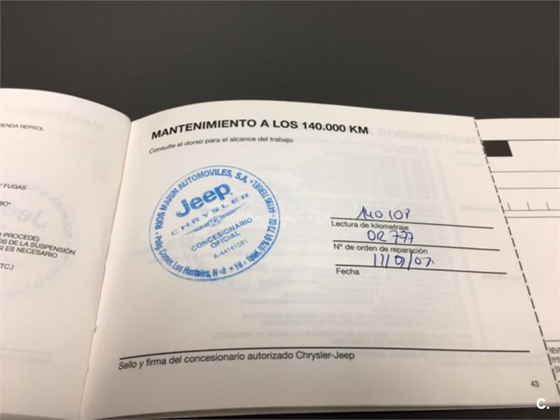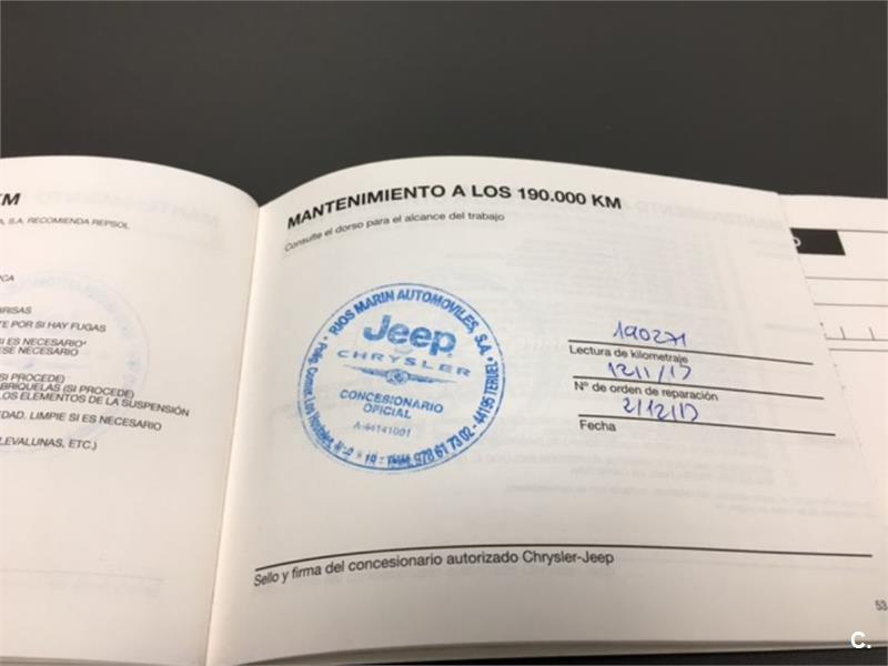 Particular. Nacional. Solo dos propietarios. 224.100km reales y demostrables, con la ficha técnica original y todos los sellos de Itv hasta la fecha. Todas las ITV favorables. Itv valida hasta 03-2018. Dispone de 4x4 y reductora, A.C, elevalunas eléctricos, cierre centralizado con mando, retrovisores eléctricos, radio cd, bola de remolque, defensa delantera y estriberas laterales. Todo homologado en ficha técnica. Conserva toda la documentación original, manual de propietario, libro de revisiones sellado desde fecha de compra hasta el año 2015 y 200.000km, dos juegos de llaves, etc. Funciona absolutamente todo. Todos los mantenimientos realizados en casa oficial Jeep-Chrysler, incluyendo cambios de correa de distribución. Interior sin rotos ni desgastes. Exterior en muy buen estado, con algunos roces pero sin golpes fuertes. Los cuatro neumáticos nuevos, puestos en verano de 2017. Nunca ha dado problemas.