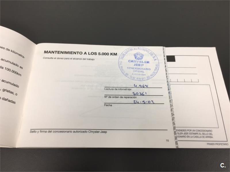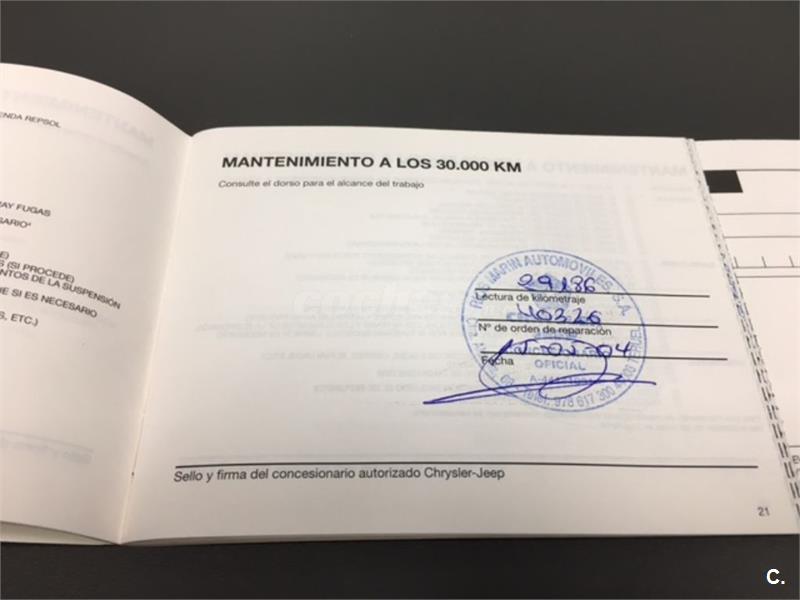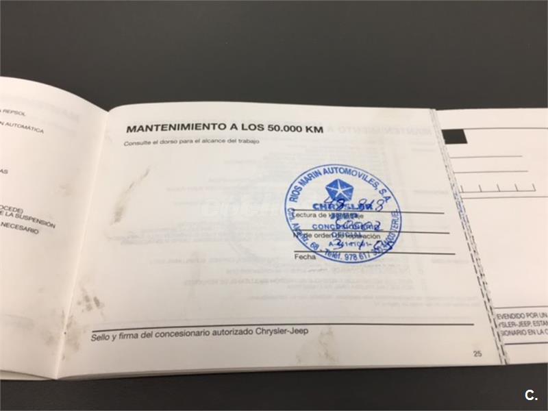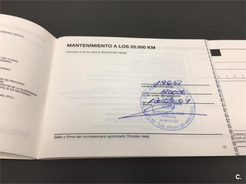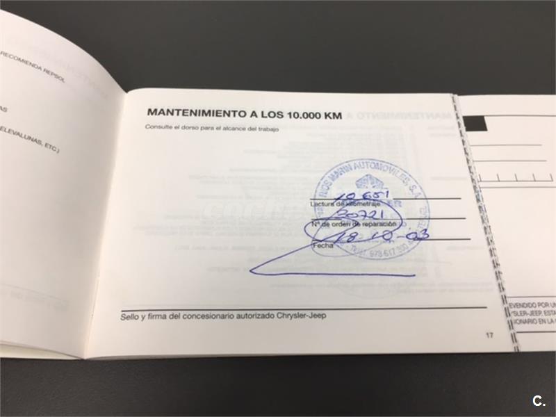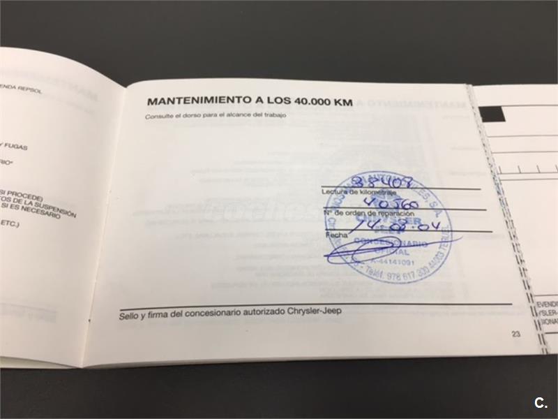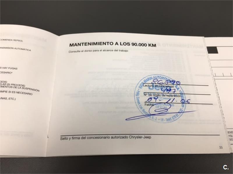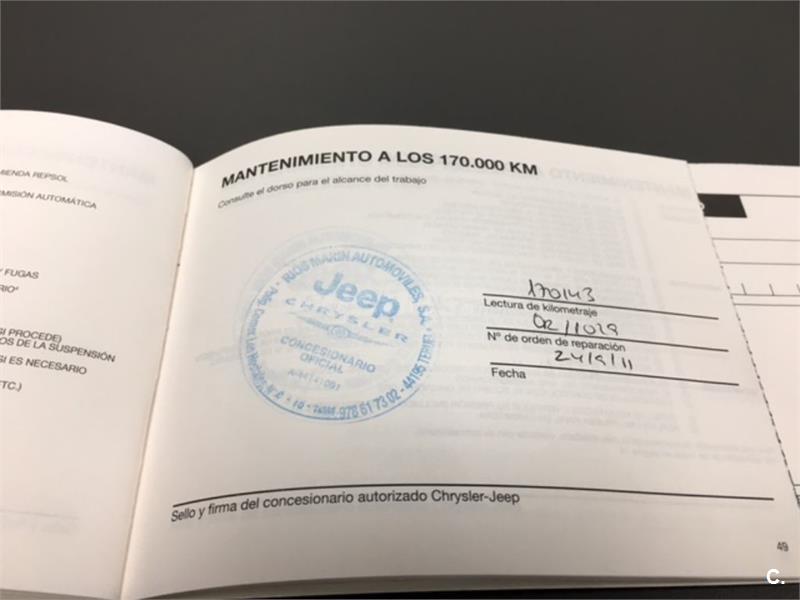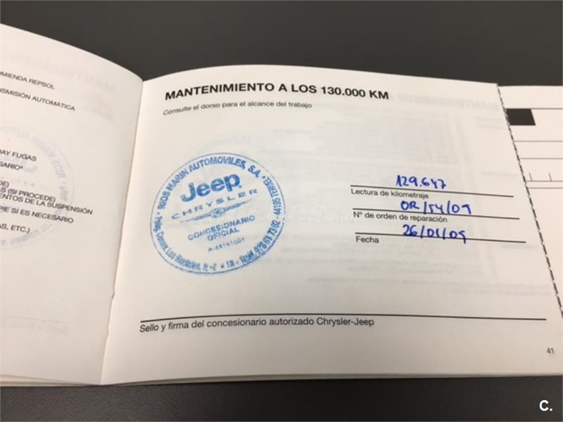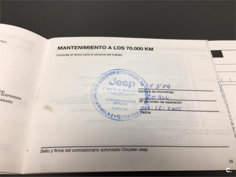Particular. Nacional. Solo dos propietarios. 224.100km reales y demostrables, con la ficha técnica original y todos los sellos de Itv hasta la fecha. Todas las ITV favorables. Itv valida hasta 03-2018. Dispone de 4x4 y reductora, A.C, elevalunas eléctricos, cierre centralizado con mando, retrovisores eléctricos, radio cd, bola de remolque, defensa delantera y estriberas laterales. Todo homologado en ficha técnica. Conserva toda la documentación original, manual de propietario, libro de revisiones sellado desde fecha de compra hasta el año 2015 y 200.000km, dos juegos de llaves, etc. Funciona absolutamente todo. Todos los mantenimientos realizados en casa oficial Jeep-Chrysler, incluyendo cambios de correa de distribución. Interior sin rotos ni desgastes. Exterior en muy buen estado, con algunos roces pero sin golpes fuertes. Los cuatro neumáticos nuevos, puestos en verano de 2017. Nunca ha dado problemas.