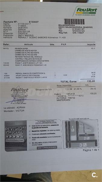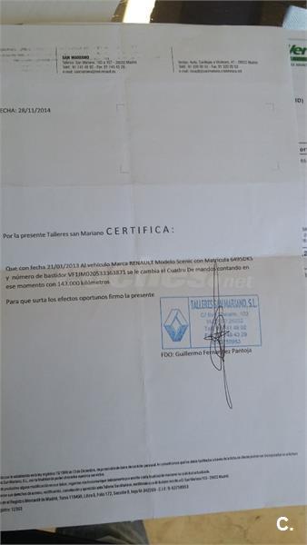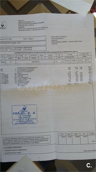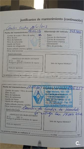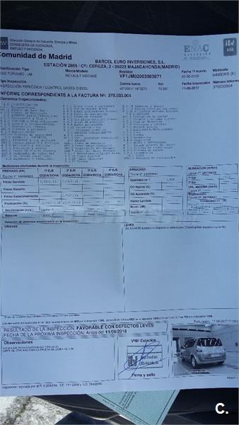 No está perfecto de pintura, pero funciona de maravilla, tiene AA, freno, limpiaparabrisas y luces automáticas, 5 plazas individuales, multitud de huecos.Embrague recien sustituido, se le cambio el cuadro con 143000km., por uno con 17000km., marca 79000, todo certificado por Renault.Libro de revisiones oficial.Solo dos dueños.Particular.