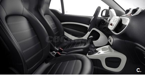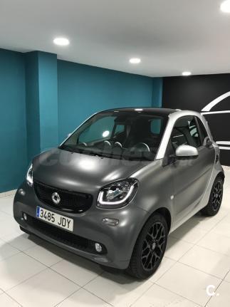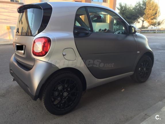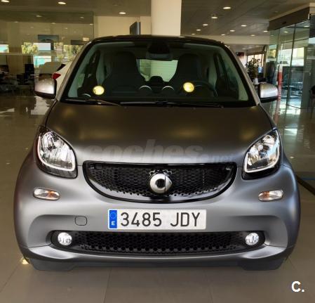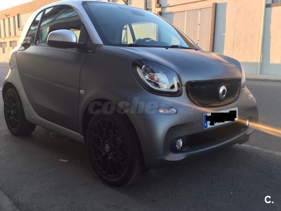 SMART Fortwo 52Kw 71 CV Acabado PRIME Año 2015, 11000 km Gris titanio mate El acabado Prime incluye: Asientos calefactados en cuero negro con costuras en gris. Tablero de instrumentos y sección central de las puertas en tela de color negro. Volante multifunción en cuero con dirección directa. Tempomat. Pomo de palanca de cambio en cuero. Ordenador de abordo. Equipamiento opcional: Cambio automático de doble embrague y 6 velocidades. Techo panorámico. Bodypanels color gris titanio mate. Cédula tridion color plata metalizado. Paquete deportivo que incluye llantas 16" de 8 radios en Y,salida de escape deportiva,tren de rodaje deportivo rebajado en 10mm y volante deportivo en cuero perforado y levas para el cambio. Paquete LED & sensor Detector de cambio de carril. El coche está impecable,1ª revisión pasada en servicio oficial,duerme siempre en garaje... El precio de ésta configuración son más de 17.000 eur.